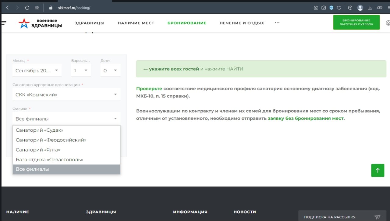 #20029Сейчас попробовал забронировать льготную путевку в Ялту и Океанский на их сайтах через раздел "Бронирование". В обоих случаях система меня перенесла на сайт skkmorf.ru А если бронировать коммерческую путевку, то онлайн-бронирование таких путевок осуществляется на сайтах СКУ.