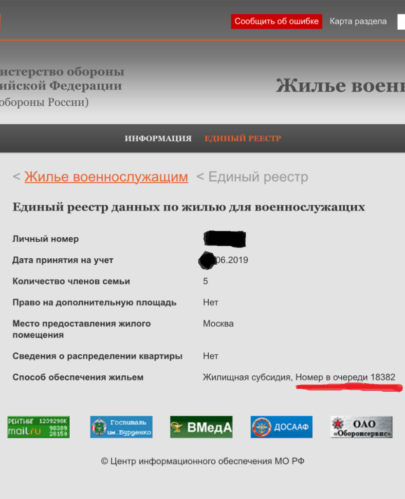 #64922pav66 видимо вам в своё время не надо было отказываться от квартиры ?Спасибо. Посмотрел... Дата принятия на учет 06.09.2016 г. Состав семьи 4 человека. Сейчас остался один. Дети решили не ждать, а строить свою жизнь, не надеясь на государство (и не веря ему). По новому учету оказался 1604-м .... Твою мать!!! Жизнь положена служению Отечеству, которое радо обобрать и пустить по-миру? Мне, в 58 лет брать ипотеку и строить жизнь по новому?!На сайте минобороны по личному номеру теперь можно увидеть номер в очереди.