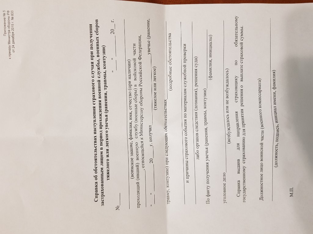#2566Выдали справку о тяжести травмы, а справку о травме не выдают это как? Для выплаты страховки, выдается справка установленного образца. Отказ выдать эту справку может быть связан с тем, что Вы не стали обращаться за данной справкой по первичному обращению. Возникшие осложнения это последствия первичной травмы и сейчас нет оснований для выдачи повторно справки о травме для страховки. Т.е. необходимо обратиться по первичному факту травмы в госпиталь и требовать справку о травме, желательно приобщить медицинские документы, подтверждающие тяжесть травмы. Обращаться надо письменно (заказным направить письмом, либо передав обращение под отметку на своем экземпляре под роспись в делопроизводство госпиталя), мотивировать свою позицию со ссылкой на Положение о военно-врачебной экспертизе, ведомственный приказ. Если Вам выдали заключение ВВК, о том, что Вы не годны к военной службе, то Вас обязаны уволить. Если Вы получили травму при исполнении обязанностей военной службы (служебных обязанностей) в следствии чего были признаны не годным к военной службе (категория "Д"), то речь идет уже о выплате единовременного пособия при увольнении, согласно Федерального закона 306-ФЗ в сумме более 2 миллионов рублей. Соответственно, если Вы первоначально травму скрыли, не указали обстоятельства её получения, то причинно-следственную связь укажут другую (заболевание получено в период прохождения военной службы) и Вам пособие не заплатят. Так что рекомендую обратить внимание не только на страховку, но и на причинно-следственную связь в заключении ВВК, так как цена вопроса может быть более 2 миллионов рублей.Подскажите пожалуйста,случай такой получил травму разрыв крестообразных связок изначально поставили не тот диагноз и говорили о выплате по легкой от неё я отказался,далее болело колено обратился ещё раз отправили в другой госпиталь там сразу поставили диагноз разрыв после прооперировали дали справку о тяжести травмы заключение ввк о негодности службы,а справку о травме не выдают как быть?в части говорят что нужно было сразу делать её но командир попросил не говорить да и я подумал что эти 50 тыс.а сейчас на кону стоит 250 тыс,как быть?