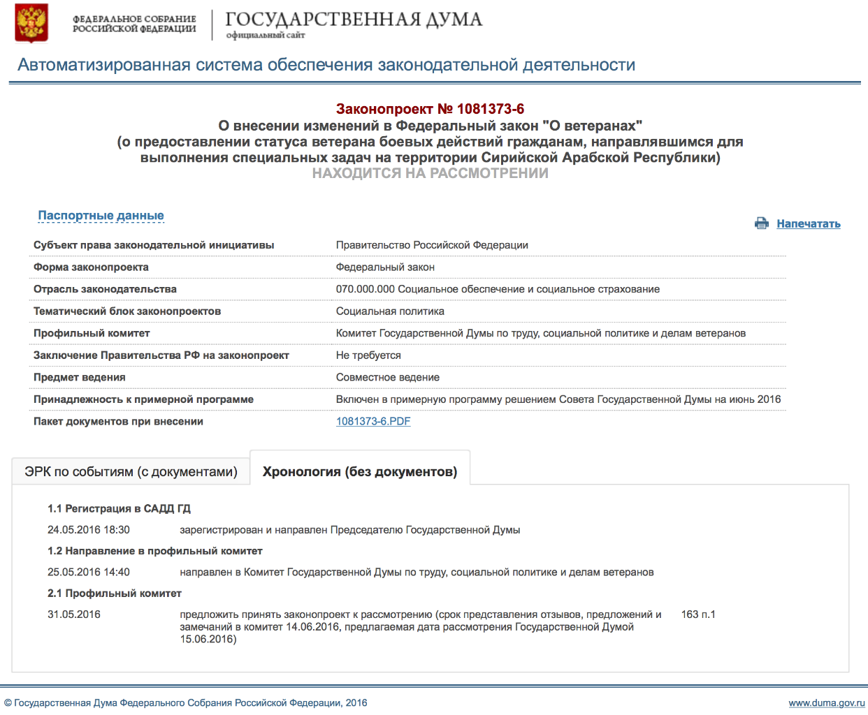 #1169Законопроект 1081373-6 о предоставлении статуса ветерана боевых действий гражданам, направлявшимся для выполнения специальных задач на территории Сирийской Арабской Республики уже находится в Госдуме, предлагаемая дата рассмотрения 15.06.2016Участники операции ВКС РФ в Сирии получат статус ветеранов боевых действий