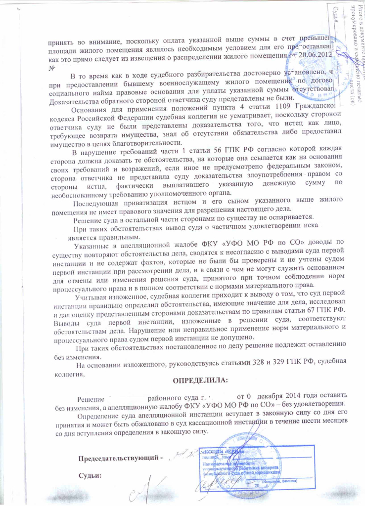 Выложу, после того, как кас.жалоба будет рассмотрена. Минобороны не устроил такой поворот событий.Elizaveta_Sm - Вы хотите сказать что выиграли по иску за сверхнорматив? А не затруднит выложить решения в том числе Мособлсуда? ?