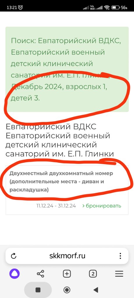 #23813Так сейчас мест значит нет. Когда откроются места на 2025 год должны появится 2х комнатные номера. Вот Светлогорский выдает места только на ноябрь. Там правда 1 взрослый 2 детей. Но думаю можно после бронирования позвонить и добавить ещё ребенка, если у вас трое детей.Так нас не интересует Евпаторийский санаторий, а, например, тот же Светлогорский не даёт забронировать путевку для 1 взрослого и 3 детей.Ну так и ищете санаторий где есть 2х комнатные номера и бронируйте его. Вот например на вскидку задала по поиску 1 взрослый 3 детей на декабрь и мне вот выдал Евпаторийский такой вариантЕсли семья двое взрослых и двое детей, то такое бронирование и размещение возможно. А если один взрослый и трое несовершеннолетних детей, то нет. Нужен двухкомнатный номер, чтобы разместиться всем вместе. Вот как такой забронировать через сайт "Военные здравницы"?Мы бронировали в прошлом году в Светлогорский 2+2. Дети в одном двухместном жили, мы через номер в другом