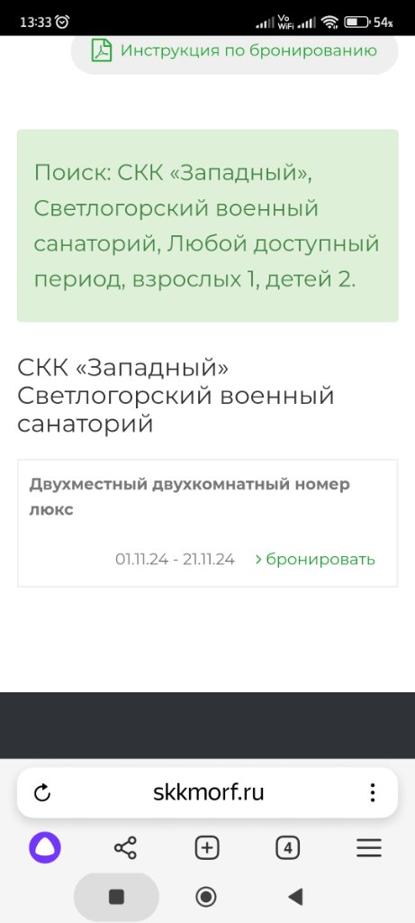 #23814Двухместный двухкомнатный в Светлогорском есть и сейчас, на ноябрь, но его невозможно забронировать на 1 взрослого и 3 детей. Меня именно этот вопрос интересует - как возможно будет забронировать? Разместиться можно, я знаю, мы с детьми жили в таком. Но как по нынешним правилам забронировать на сайте непонятно.Так сейчас мест значит нет. Когда откроются места на 2025 год должны появится 2х комнатные номера. Вот Светлогорский выдает места только на ноябрь. Там правда 1 взрослый 2 детей. Но думаю можно после бронирования позвонить и добавить ещё ребенка, если у вас трое детей.Так нас не интересует Евпаторийский санаторий, а, например, тот же Светлогорский не даёт забронировать путевку для 1 взрослого и 3 детей.Ну так и ищете санаторий где есть 2х комнатные номера и бронируйте его. Вот например на вскидку задала по поиску 1 взрослый 3 детей на декабрь и мне вот выдал Евпаторийский такой вариантЕсли семья двое взрослых и двое детей, то такое бронирование и размещение возможно. А если один взрослый и трое несовершеннолетних детей, то нет. Нужен двухкомнатный номер, чтобы разместиться всем вместе. Вот как такой забронировать через сайт "Военные здравницы"?Мы бронировали в прошлом году в Светлогорский 2+2. Дети в одном двухместном жили, мы через номер в другом