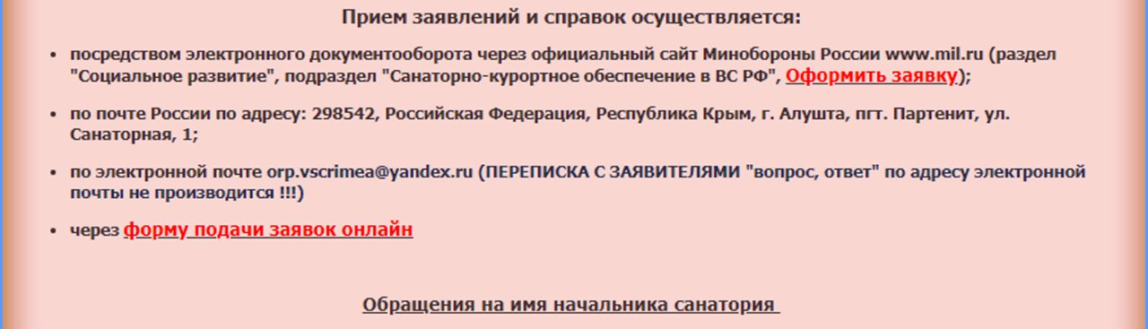 #14861Вот здесь:QR_BBPOST В понедельник из "Черновиков" случайно отправила заявку на 2021 год в "Крым" на электронный адрес,который был указан на сайте санатория,робот подтвердил получение,и вот сегодня получила ответ,что на данный адрес заявки на путевки не принимают-это,видимо,подтверждает выше изложенную информацию.Электронного адреса для заявок на сайте теперь тоже нет,остался только адрес для обращений к начальнику.Может быть,есть у кого-то электронный адрес санатория "Крым"?Буду признательна.