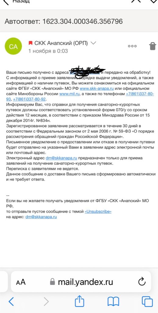 #22468Из Анапского СКК нет ответа даже о получении ими заявки и регистрации, посылал в 00.00 на себя в Дивноморское и дочь в Бетту.