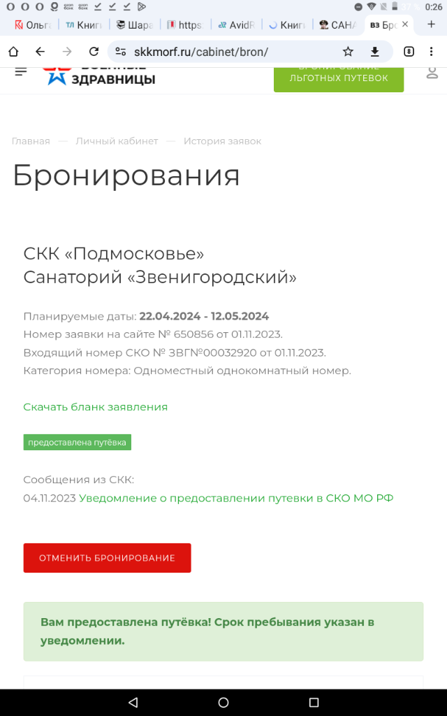 #22758Сегодня пришло уведомление о предоставление путевки в Сакский санаторий на середину августа.Бронировал на сайте ВЗ рано утром 01.11.