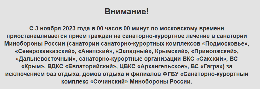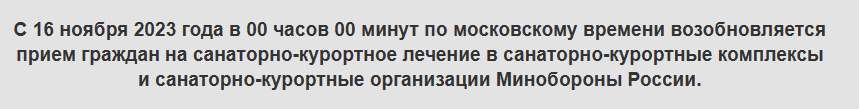 #22813На сайте МО РФ появилось сообщение, что с 16 ноября возобновляется прием граждан на санаторно курортное лечение.
