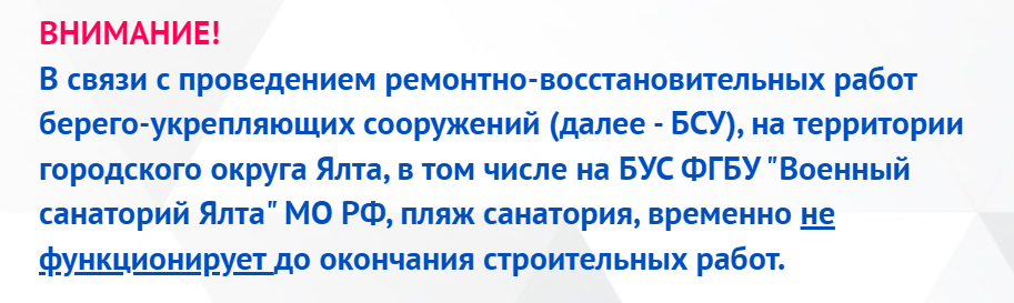 #23684Мы отдыхали в нашей Ялте в августе, с друзьями решили сходить на наш пляж, посмотреть, как и че там творится?На главной странице официального сайта санатория "Ялта" указана соответствующая информация:Снимок_Пляж санатория.PNGИз-за аварийного состояния вроде.