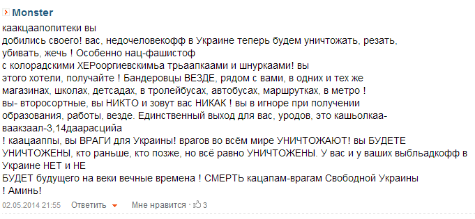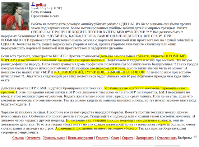 «Глядя на горящих людей, выбрасывающихся из окон, евромайдановцы смеялись: "О, еще один колорад готовится к полёту...» - нарыто на просторах интернета. http://beauty-spirit.livejournal.com/111116.html