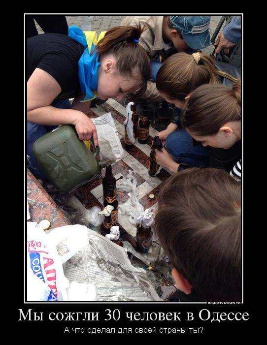 Одного одессита сожгли заживо коктейлем Молотова, который разливали милые девушки с флагами Украины.