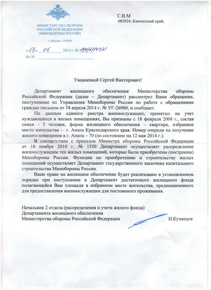 Ответ очень "содержательный". Особенно если учесть обещания Пирогова о том, что там где жилье не строится (в необходимом количестве и соответствующих квадратов) для военнослужащих вставших в очередь до 2012 года оно будет закуплено в первом квартале 2014 г. А вам ведь надо не менее 90 кв. м. Ко всему прочему вы по новым правилам внеочередник. Неужели 69 человек, стоящих впереди вас и претендующих на Анапу, имеют троих и более детей? Вопрос да? Неужели на Анапу все внеочередники? Вместе с этим отмечаю, что в домах на Евскина (для выполнения норм по площади) вам надо предлагать 2 квартиры. В московских кварталах это практикуется повсеместно. Отличный вариант в левом крыле. Трехкомнатная и двухкомнатная.