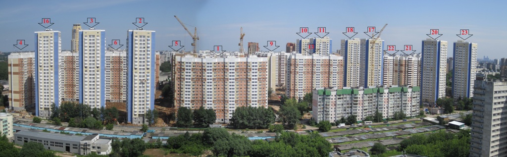 Вид на микрорайон со стороны улицы Смольной с нумерацией корпусов.