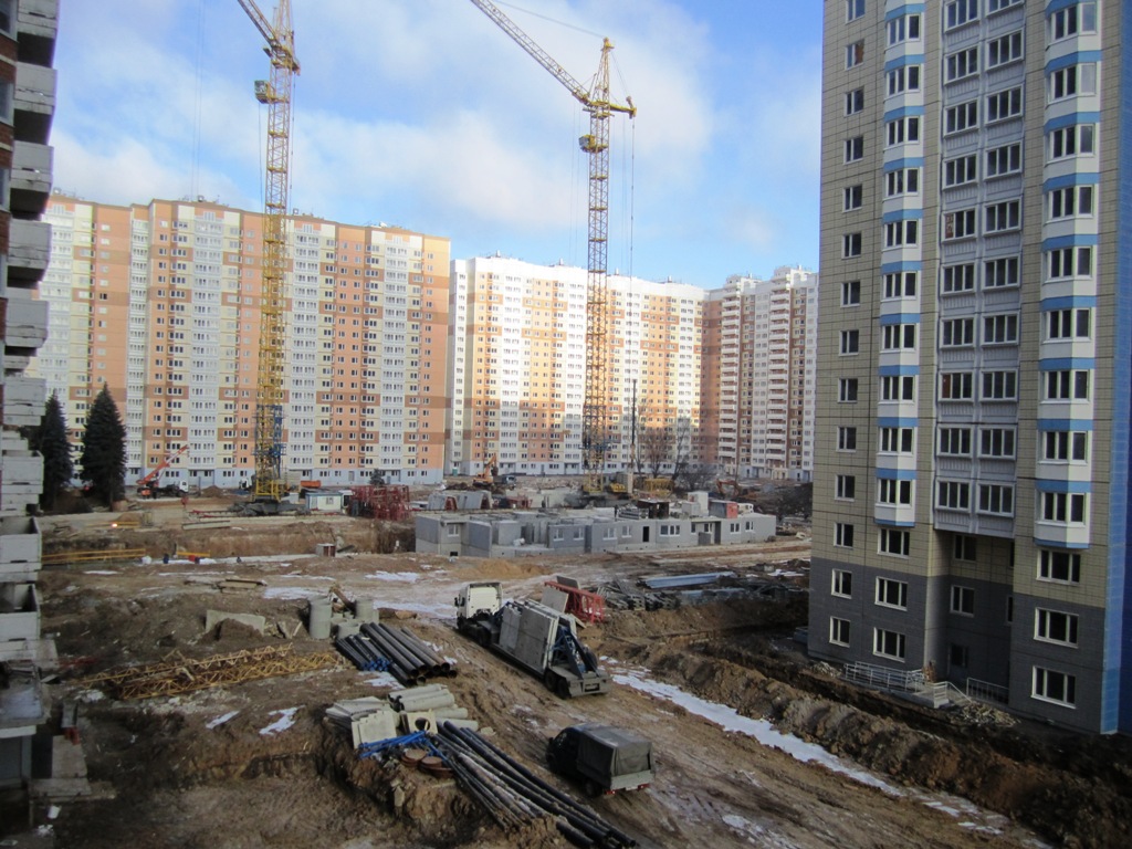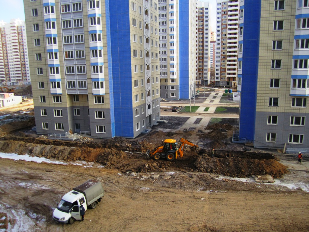 Воспользовавшись заморозком, сковавшим грязь, прошелся по стройке. Работа кипит, где вчера укладывали плитку и укатывали асфальт, сегодня снова роют траншеи. Ведутся работы по прокладке теплотрасс, канализации, ливневки и кабелей. С территории начали вывозить горы грунта и строительного мусора. В четыре корпуса первой очереди дали тепло. Во многих корпусах ведутся отделочные работы, стелют линолеум, клеят обои, мороз не помеха. 12 корпус - два подъезда первый этаж, два - заливают фундамент, 19 корпус - 19 этаж, 24 корпус - 17 этаж.
