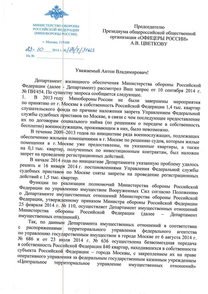 Тогда 26.08.2014г. я написала заявление на сайт МО РФ. Мне пришло уведомление, что заявление для рассмотрения отправлено в ДИО. Входящий 3023 от 2.09.2014г., исполнитель – начальник отдела земельных правоотношений Микава И. В. С 29 сентября я пыталась попасть на прием. Дозвониться по многочисленным телефонам не представлялось возможным, т. к., по словам секретаря, Микава И.В. практически непрерывно находится на совещаниях. Секретарь передала мою просьбу о личной встрече и не отправлять ответ по почте, а передать в руки. 3.10.2014г. истек срок рассмотрения моего заявления, а ответа нет.