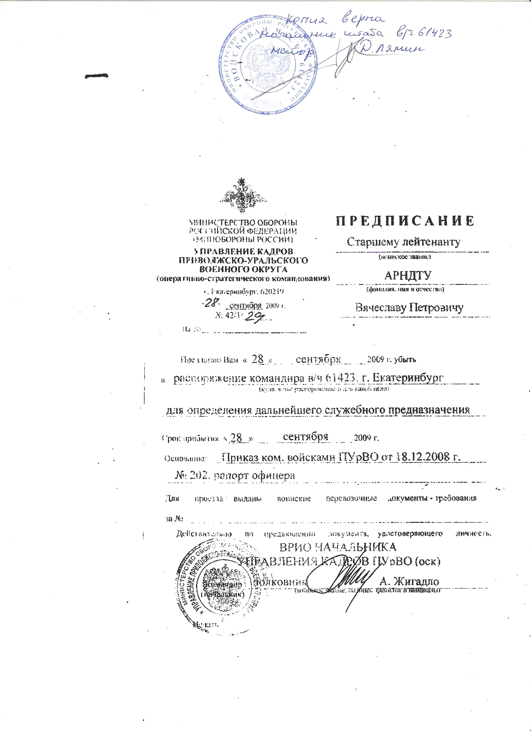 а кто такой командир вч 61423? Он может зачислять в распоряжение по номенклатуре 410 приказа?