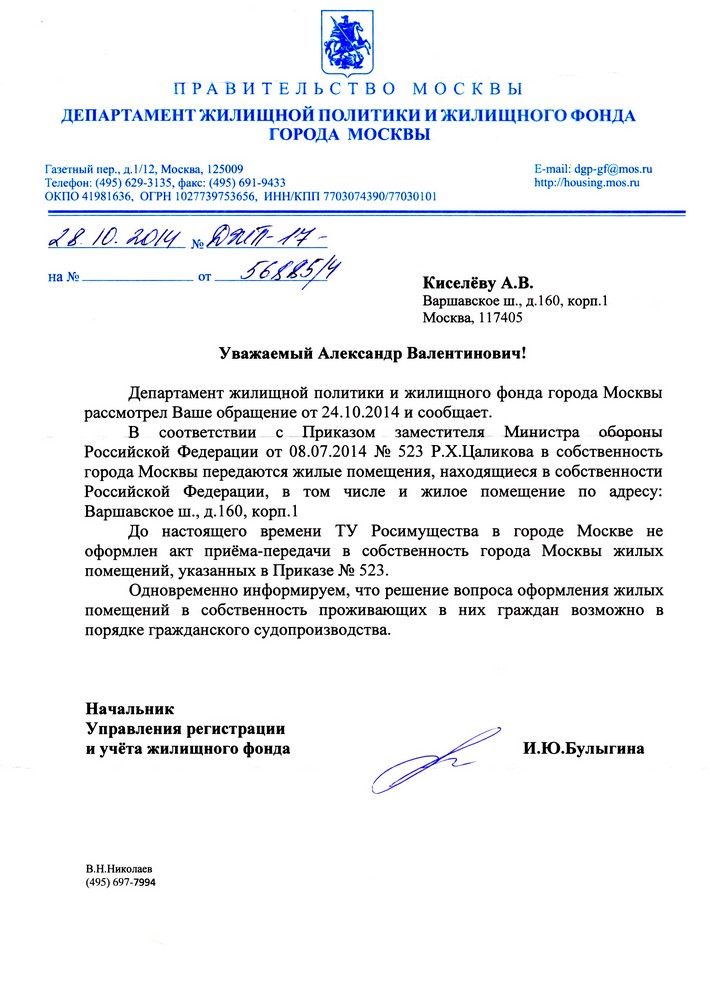 Позвонил в Департамент по жилищной политике, перенаправили в ЮАО http://mosopen.ru/goverment/835 те перенаправили в Росреестр, а там стоит ОУ, а не собственность Москвы.риказ министра обороны российской федерации № 523 от 8 июля 2014 почитать