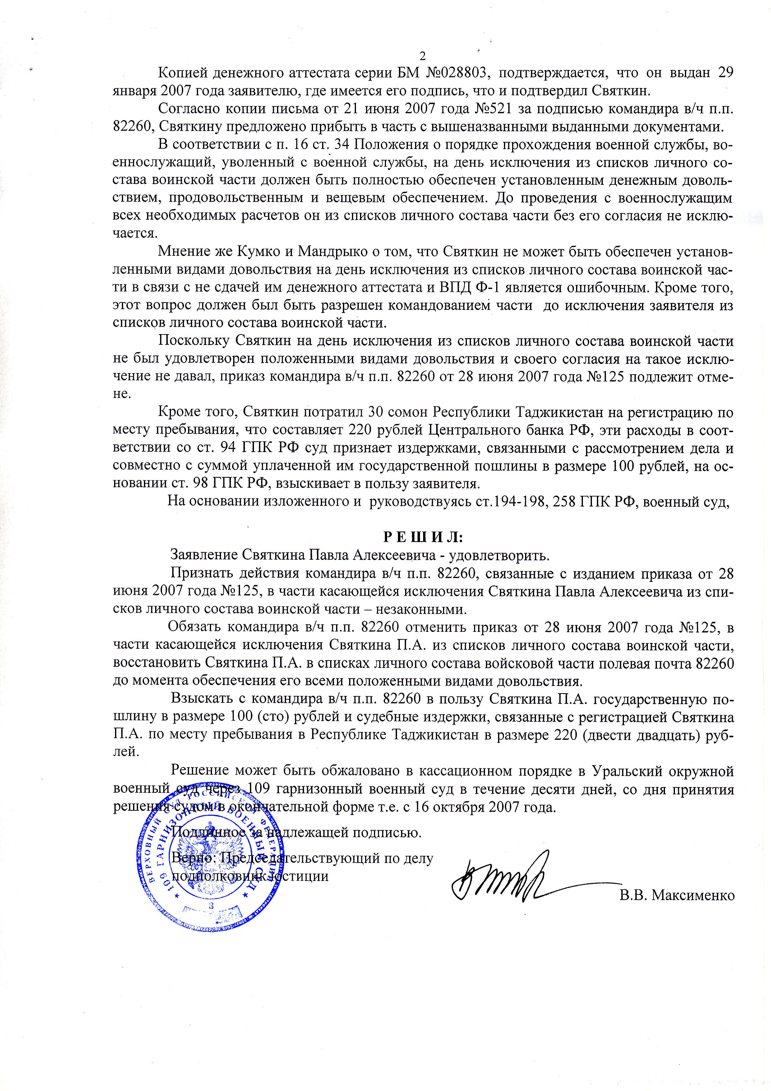 На момент исключения меня из списков личного состава XXX я не был удовлетворён полным количеством суток недоиспользованной части основного отпуска, денежным довольствием в полном объёме. Согласия на исключение из списков личного состава XXX без полной выплаты, причитающихся мне денежных средств, и не предоставленной недоиспользованной части основного отпуска я не давал.