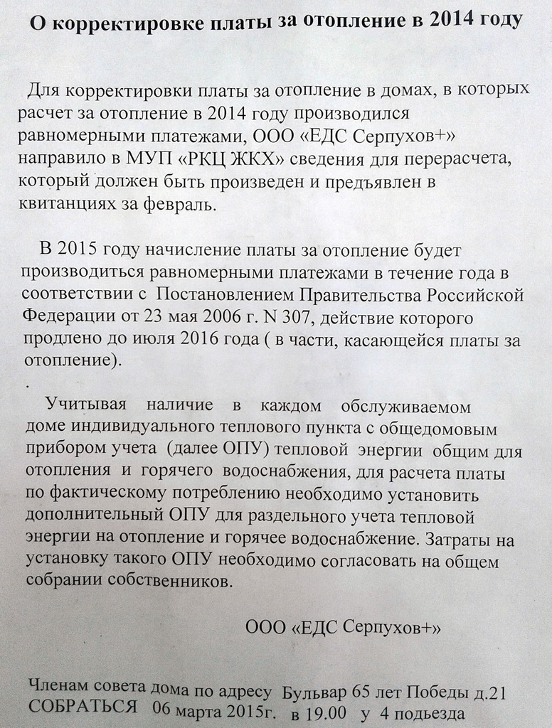 Уважаемые жильцы д.21 по бул. Победы! Сегодня прочитал на входе объявление об оплате за тепло и покупке и установке (как я понял, за счет жильцов) какой-то хреновины, чтобы это тепло считать отдельно от горячей воды
