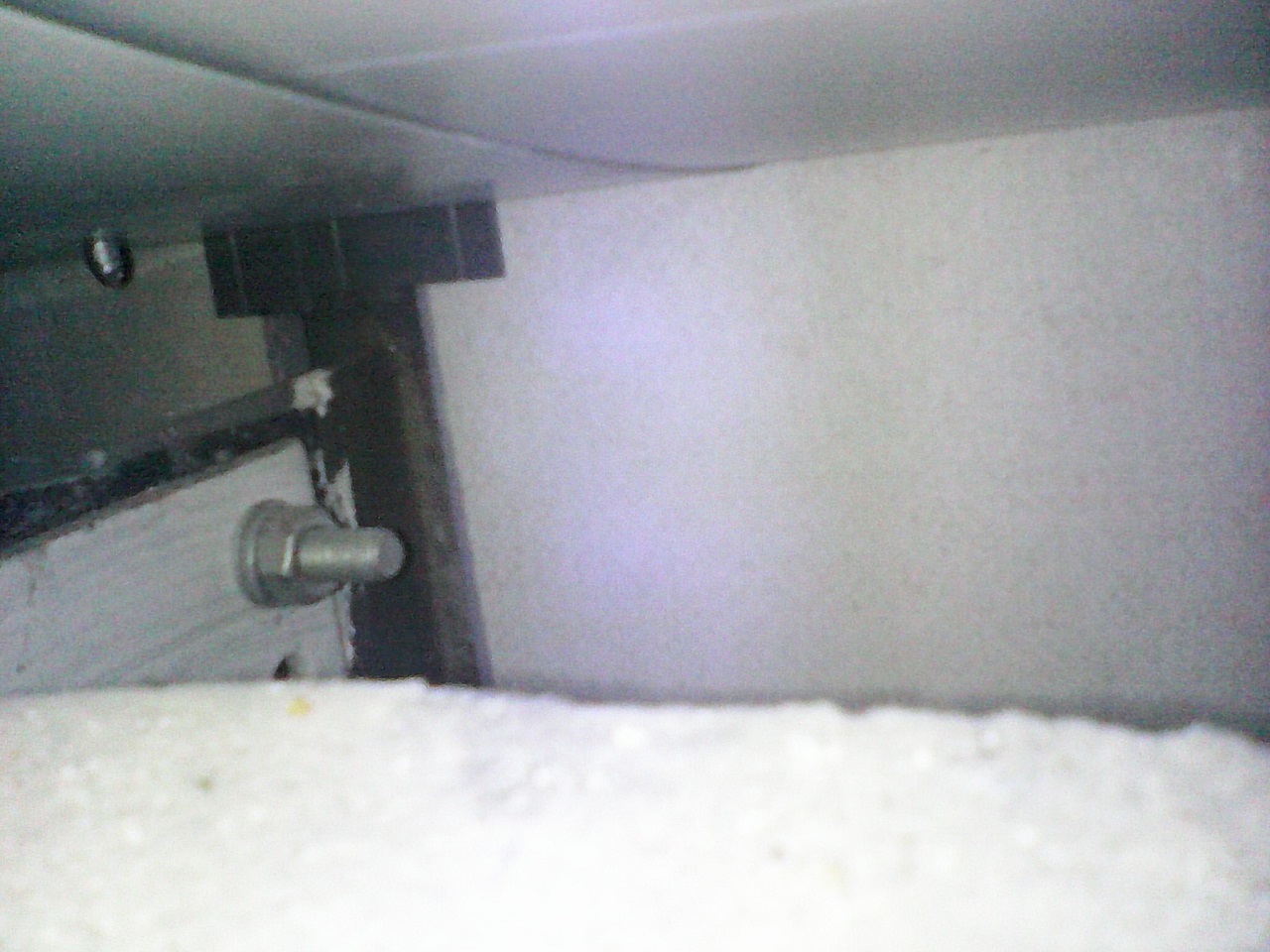 А вот почему вода так легко попадает вниз, видно на фото! Под железом на полу балкона действительно скрыта щель к соседям шириной сантиметров десять. А кронштейн-это крепление нашего остекления!!!!! Жутко стало...Хотя...наверное они всё учли, надеюсь.