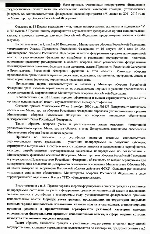 Ответом заинтересованного лица от 7 октября 2014 года (получен по почте 6 ноября 2014 года), мне было отказано во включении в списки участников подпрограммы "Выполнение государственных обязательств по обеспечению жильем категорий граждан, установленных федеральным законодательством" Федеральной целевой программы "жилище" на 2011 - 2015 годы», со ссылкой на то, что я не отношусь к категории граждан, указанных в п.п «а» п. 5 Правил выпуска и реализации государственных жилищных сертификатов в рамках реализации подпрограммы "Выполнение государственных обязательств по обеспечению жильем категорий граждан, установленных Федеральным законодательством" Федеральной целевой программы "Жилище" на 2011 - 2015 годы ( Постановление Правительства РФ № 153 от 21 марта 2006 года), далее – Правила.