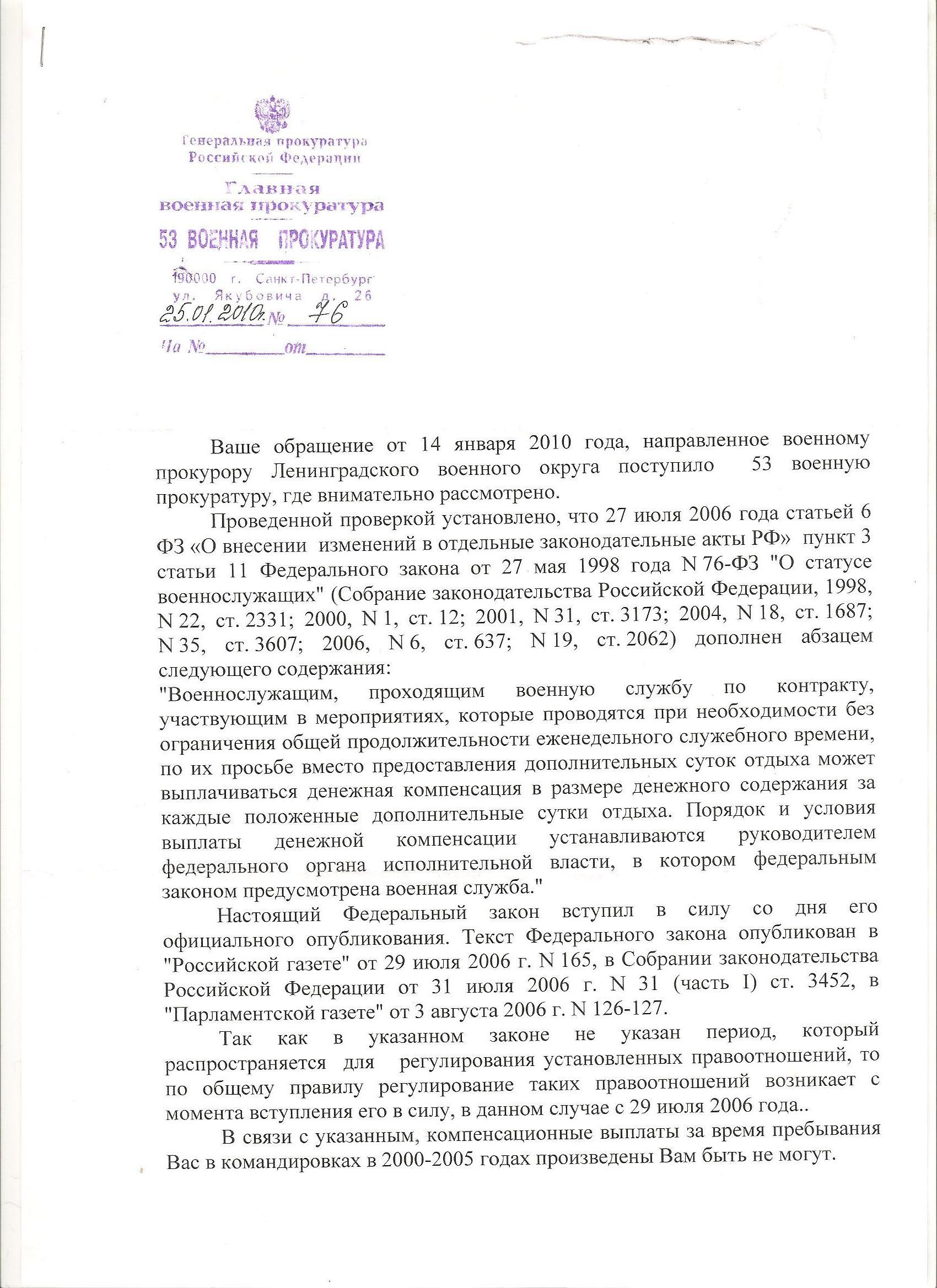 #178Прокуратура Лен. во отписала мою жалобу опять в 53 прокуратуру и те прислали ответ: компенсация не положена. Проси выходные натурой. Откажут - иди в суд, если успеешь. В общем дали понять, что я не прокурорских кровей и решение суда как у Балеевского мне не видать. Думаю, что так оно и будет. Попробую отгулять натурой ссылаясь на обзор Верховного суда за 2002 год. Тут, если откажут, придется судиться, и наверное до того самого Верховного суда.скорее всего придется судиться за представление выходных натурой.