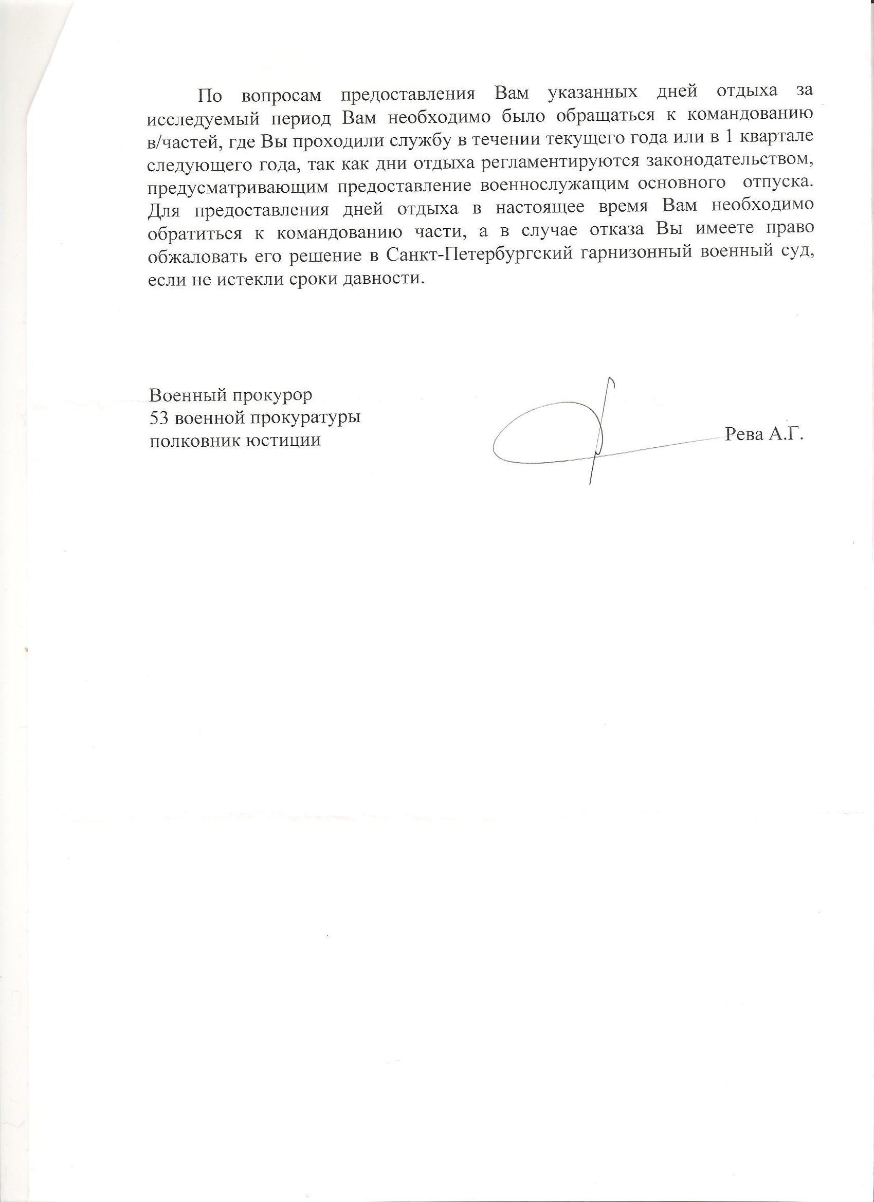 Выборгский гарнизонный военный суд жалобу удовлетворил, признал приказ об исключении Б. из списка личного состава незаконным и обязал командира части предоставить ему отпуск за неиспользованные дни отдыха продолжительностью 158 дней с производством всех необходимых выплат, после чего уволить с военной службы.
