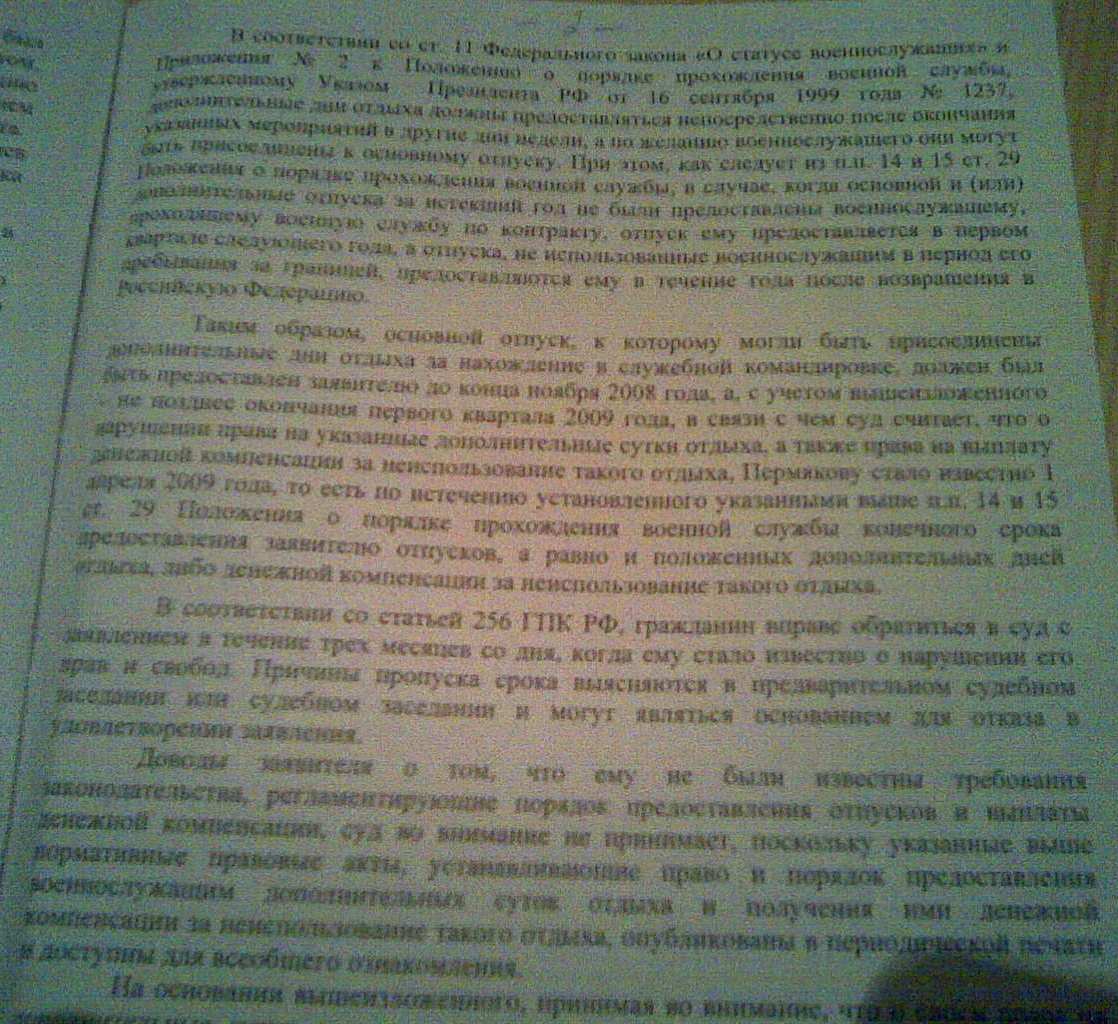 Имею необходимость в помощи. находился в командировке с апр 2006 по ноябрь 2007. в ноябре 2009 узнал что можно получить компенсацию за неиспользованные сутки отдыха. Военком отказал. мотивируя, что предоставляется 30 суток и в течении года. Суд отказал, мотивируя тем. что доп сутки отдыха должны быть предоставлены в бижайшие дни. могут быть прикреплены к основому отпуску, а срок предоставления отпуска прошел.