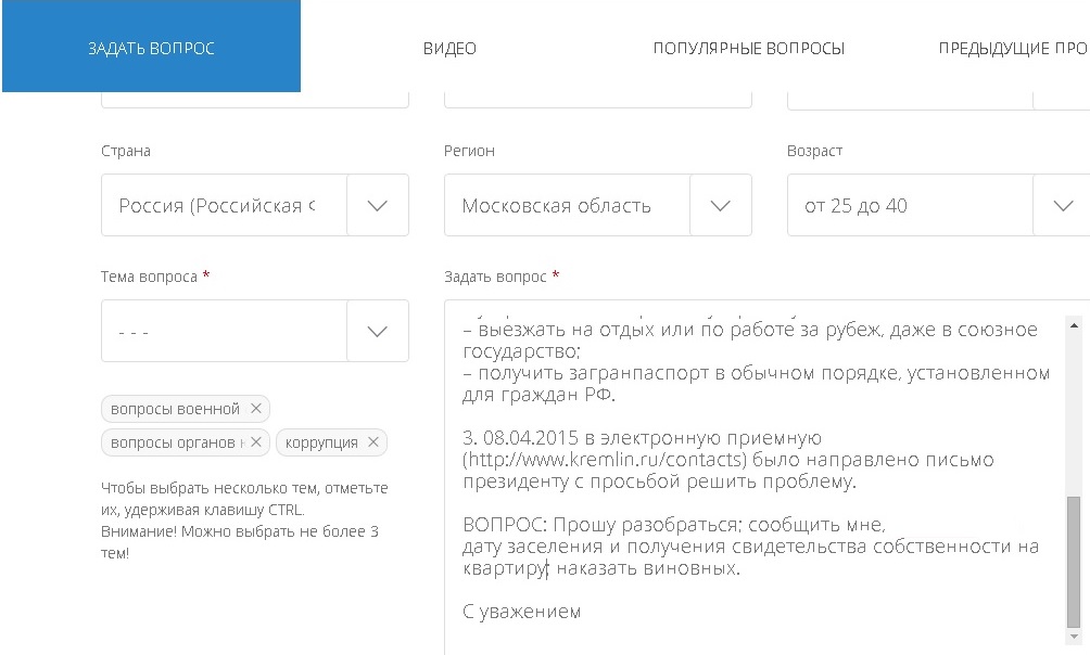 у, в общем, отправил... Выделил три тематики: 1) военная служба, 2) государство, общество, политика, 3) вопросы жилья и коммунально-бытового обслуживания.