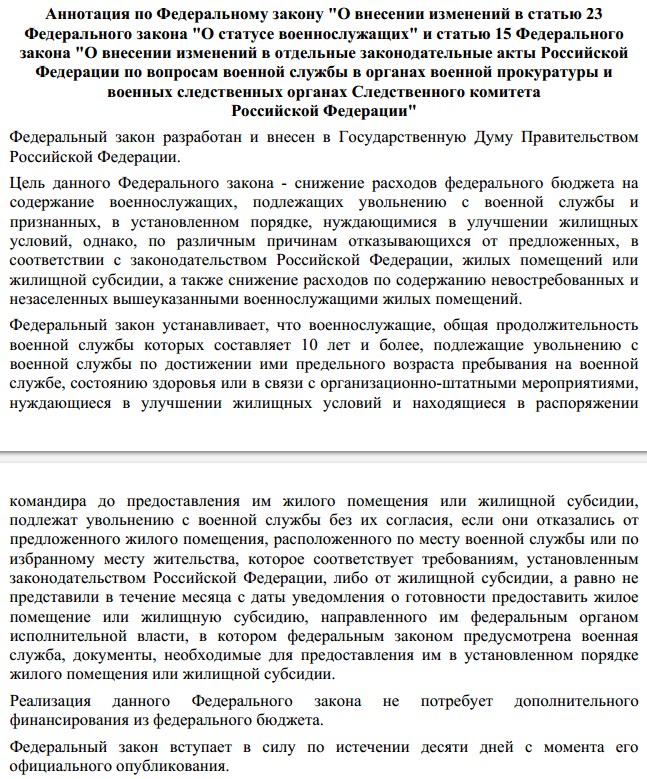 Ведь в связи с этим законопроектом законодатель допускает увольнение военнослужащего, НАСТАИВАЮЩЕГО НА ИСКЛЮЧИТЕЛЬНОСТИ ОПРЕДЕЛЁННОЙ ФОРМЫ ЖИЛИЩНОГО ОБЕСПЕЧЕНИЯ, КОТОРАЯ В НАИБОЛЕЕ ПОЛНОЙ МЕРЕ СООТВЕТСТВУЕТ ИНТЕРЕСАМ ЕГО СЕМЬИ, без жилья, без его на то согласия.