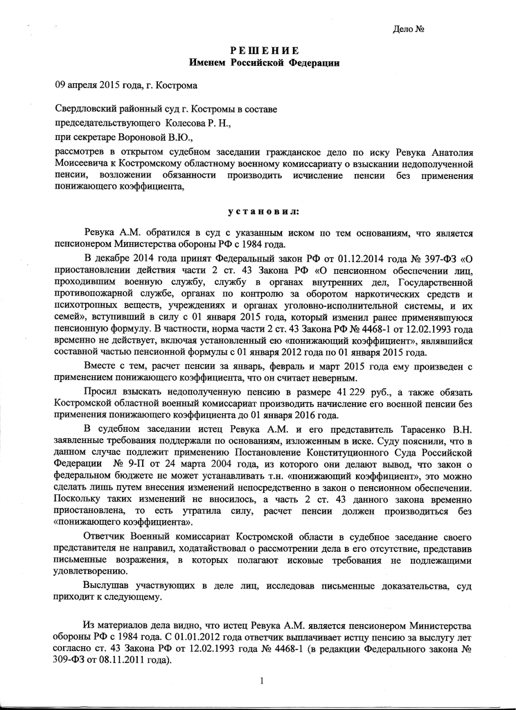 Уважаемый RVSN777,я с большим почтением отношусь к Вашим конкретным делам по восстановлению пенсионного права. Не посчитайте мой вопрос обидным .. Мне просто интересно как Вы сами воспринимаете закон о приостановлении второй части ст. 43. По моему , довольно ясно ,что закон принимался с целью приостановления части 2 ст.43 только в части увеличения на 2% и более денежного довольствия для исчисления пенсии . Однако при формулировании статьи 1 указанного закона ,то ли по некомпетентности ,то ли по каким -то другим причинам ,статья была сформулирована не корректно ,что позволяет трактовать ее ,как приостановление статьи 43 целиком. Так вот Вы -то основываете иск на ошибке ,или уверены ,что Госдума сформулировала правовой акт правильно и приостановила ст.43 целиком. :oops: