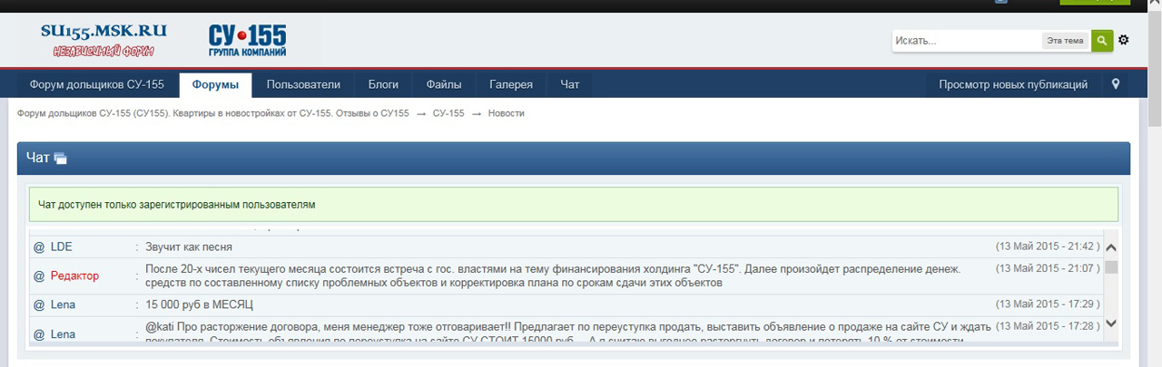 Может не всё потерянно http://www.gazeta.ru/realty/news/2015/0 ... 1341.shtmlВ мае в СУ-155 обещали активность на стройке, если строители до лета не появятся, то скорее всего подрядчика действительно собрались менять. Кто-нибудь заметил скопление рабочих на объекте, праздники уже закончились?