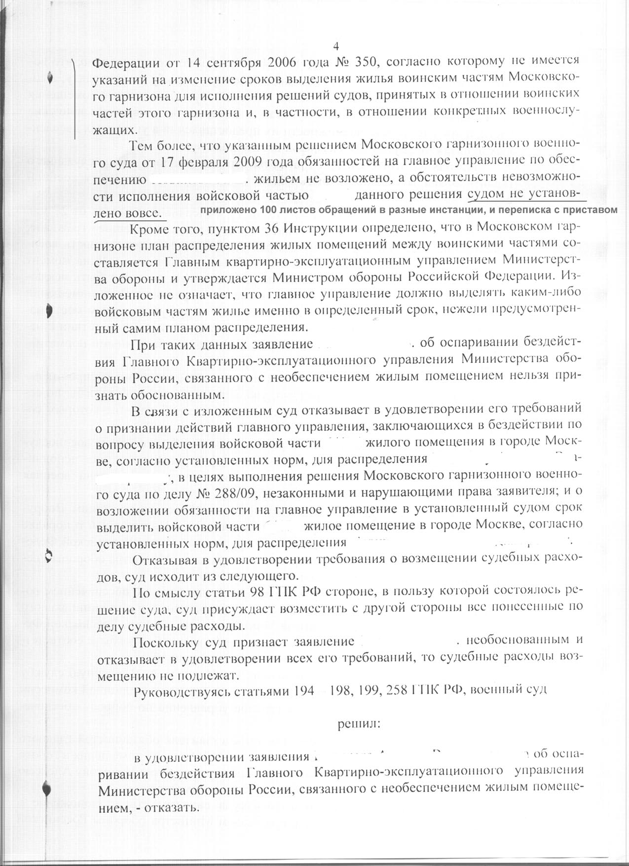 "вопреки мнению заявителя обязанностей ГлавКЭУ по выделению войсковой части *** жилого помещения в городе Москве, согласно установленных норм, для распределения **** в какой либо срок не имеется"