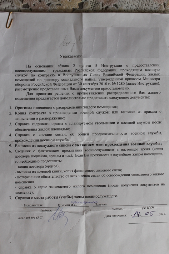 #13096Нам тоже в понедельник пришли недостатки, обновить выписки из домовой книги, справки от паспортиста, копию лицевого счета, и сделать обязательство об освобождении служебки. (до этого не делали)К слову, я дешевле чем 1100 руб не нашла за 4 человек, нотариус Красноказарменная дом 3 тел.8-495-697-11-28.Всем доброго дня! Только, что позвонили из части (направленец). Пришли недостатки по документам (сдавал в конце мая 2014 г.) Какие не знаю, обещала скинуть на электронку. Думаю, что все справки устарели и надо их обновить. Как придут недостатки, выкину на форуме.