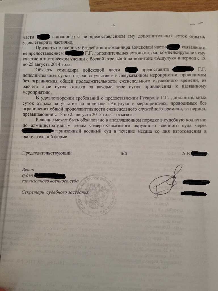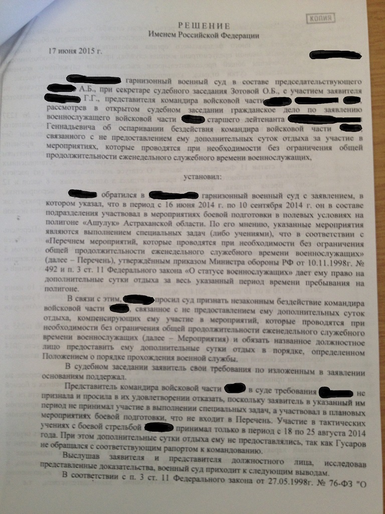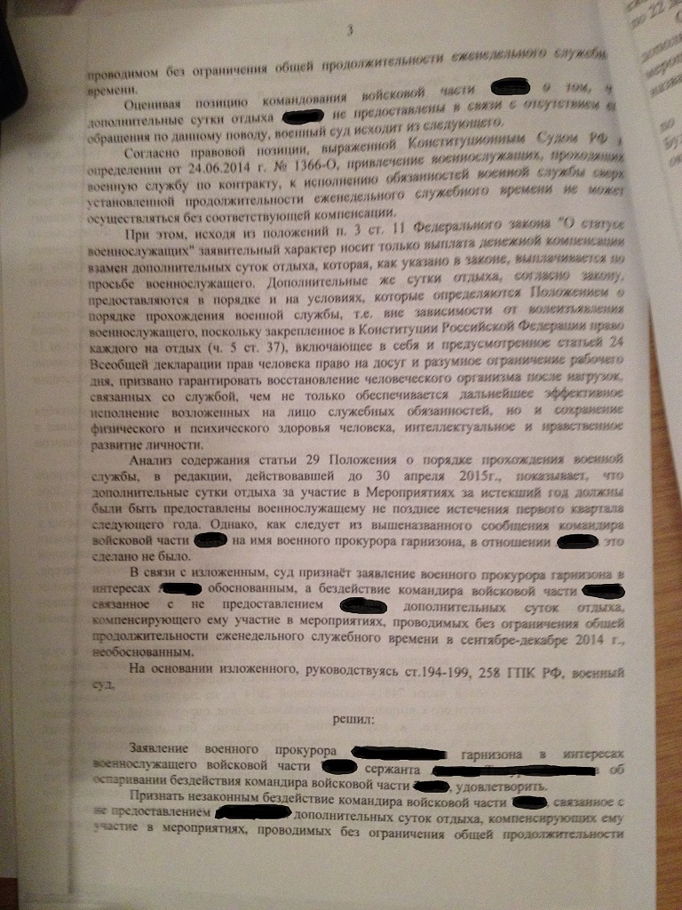 Уважаемые борцы, выкладываю судебное решение по поводу оспаривания бездействия командира в/ч связанного с непредоставлением дополнительных суток отдыха за участие в мероприятиях проводимых без ограничения еженедельного служебного времени.Как ни странно, суд ЧАСТИЧНО удовлетворил требования офицера.