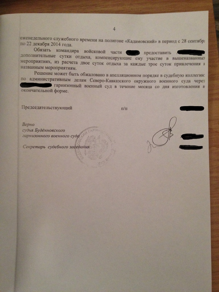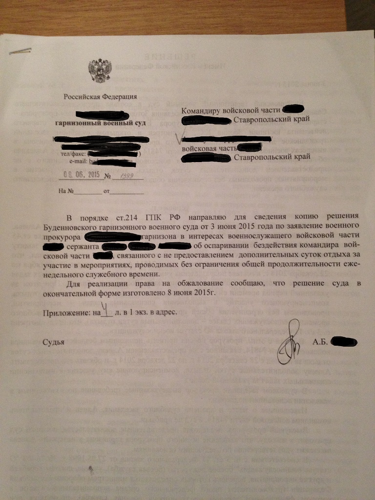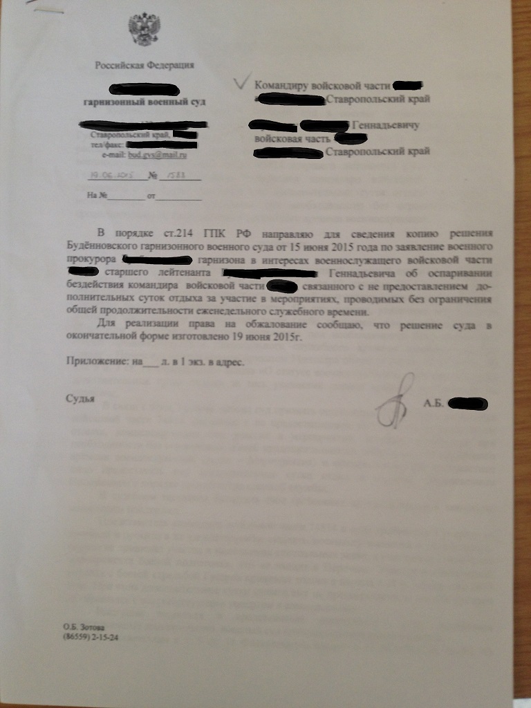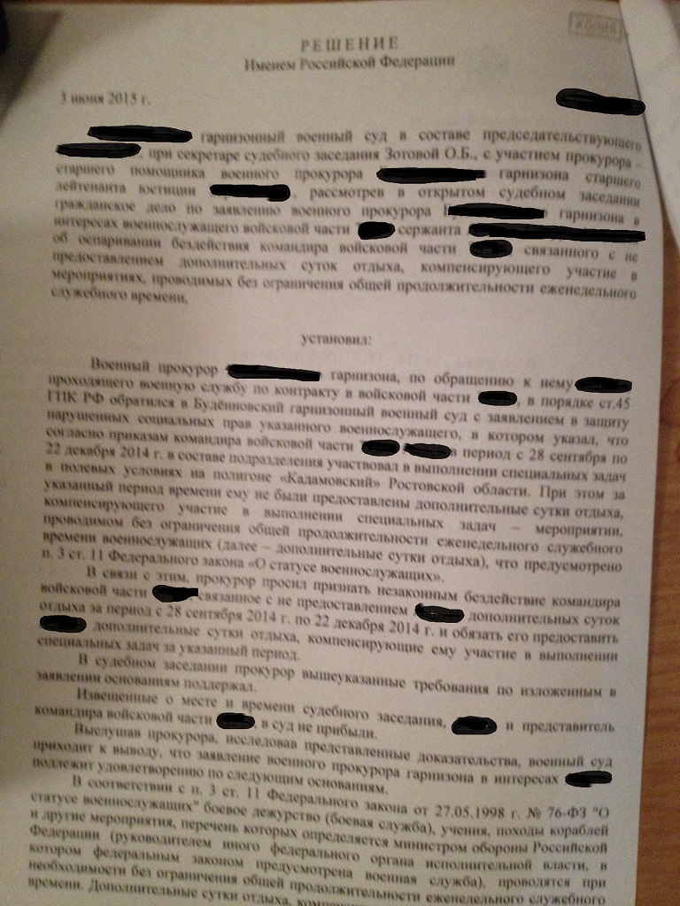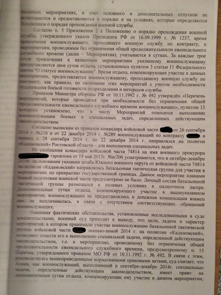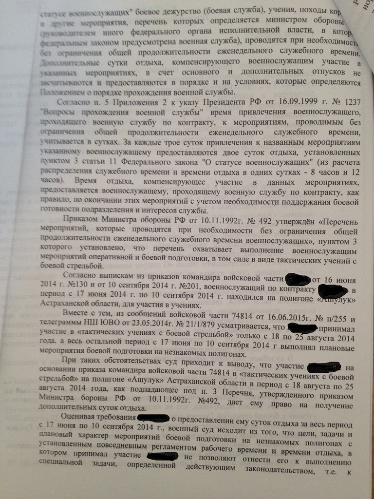 Уважаемые борцы, выкладываю новое судебное решение по поводу оспаривания бездействия командира в/ч связанного с непредоставлением дополнительных суток отдыха за участие в мероприятиях проводимых без ограничения еженедельного служебного времени.Суд УДОВЛЕТВОРИЛ требования сержанта.Суд обязал предоставить дополнительные сутки отдыха из расчета 3 дня полигона=2 суток отдыха.Пользуйтесь, и отдыхайте в отпусках