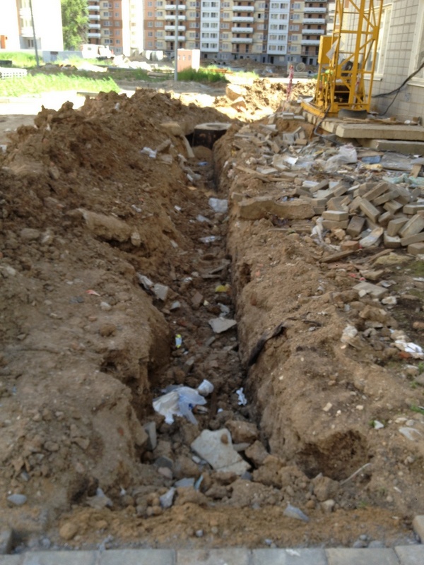 Была на стройке - тишина. Ну, и понятно - выходной же. Ни одного человека нет. Из нового: у 16, 3 и 2 корпусов вырыта траншея, соединяющая колодцы. (Фото ниже) Между 16 и 3 корпусом просела дорога.