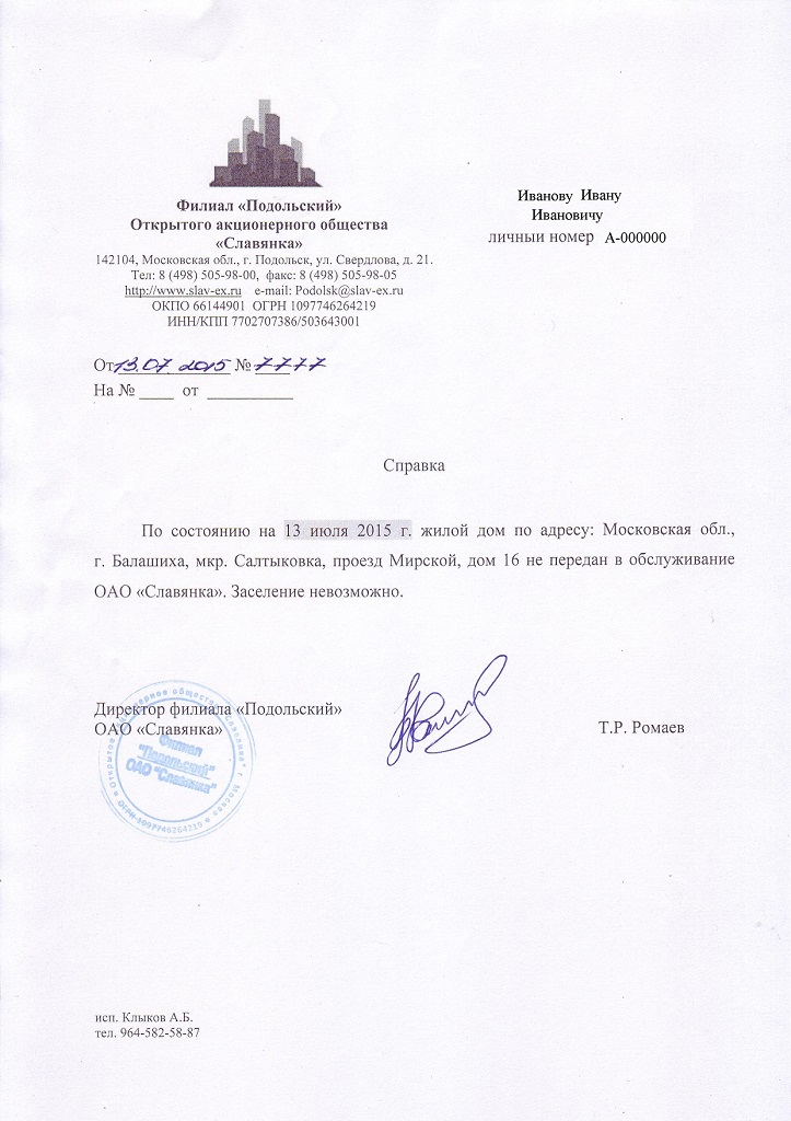 #2672К сожалению сканир не могу, почему в Подольске, я так понял что 16 дом они принимают и оказывается я у них не первый кто обратился за справкой.Привет а можете в Л.С или сюда выложить скан справки ? может поможет и нам остаться в списках очередников ...и еще почему справку по Салтыковке, выдают в Подольске , там штаб СлавянкиЕсли быт точнее я только в РУЖО получил РЕШЕНИЯ в собственность, согласно которого имеют права исключить из списков части, но я в Подольске в ООО Славянка в Кузнечики взял справку о том что жильем обеспечен но данное жилье не эксплуатируется.