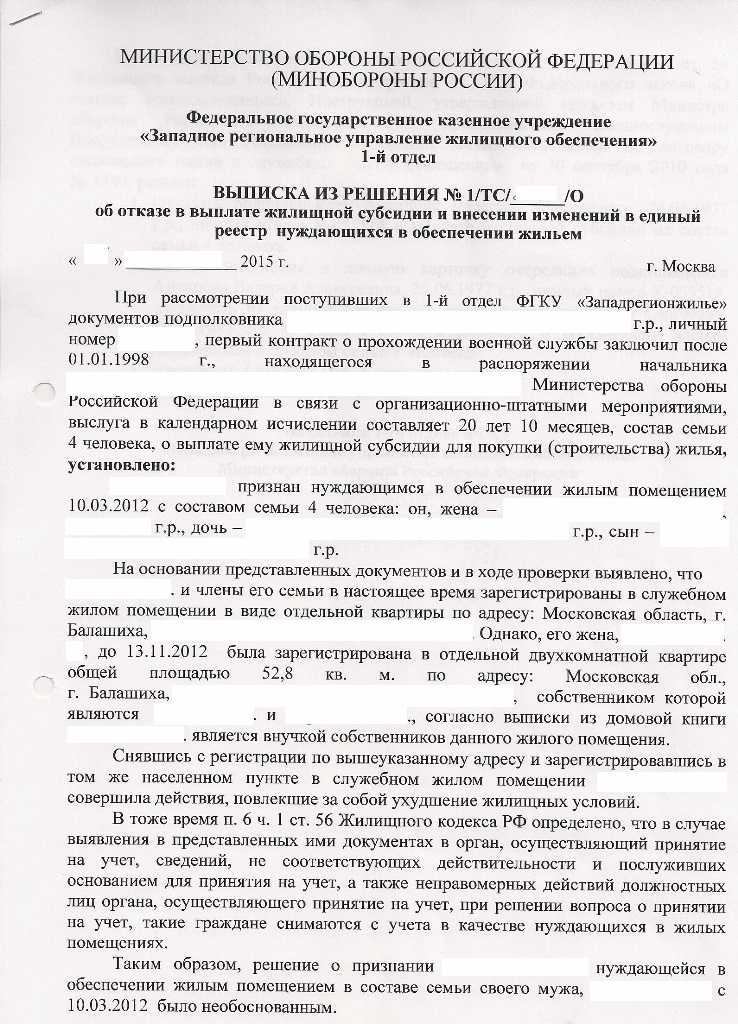 #6028Полагаю, сложились явные, сознательные, условия препятствия со стороны РУЖО и Вам суды, адвокаты это длительный путь - обращайтесь с жалобой на РУЖО в следственный комитет гарнизона или округа- дело для этого созрело и почитайте и внесите в текст жалобы, соответствующую статью или пункт ПП РФ от 16.08. 2012 г № 840 !!!........Уже не пересчитает. В решении указано не только снятие с учёта, но и отказ в выплате ЖС. Если бы написал новое, на троих членов, тогда да. А теперь только вернулось всё к натуральному жилью.Во как! А откуда сее следует? Я так понимаю РУЖО просто пересчитает итоговую сумму ЖС и ....Привет!......QR_BBPOST Вы по закону можете перейти обратно с ЖС на обеспечение натуральным жильем. И даже выбрать новое ИПМЖ