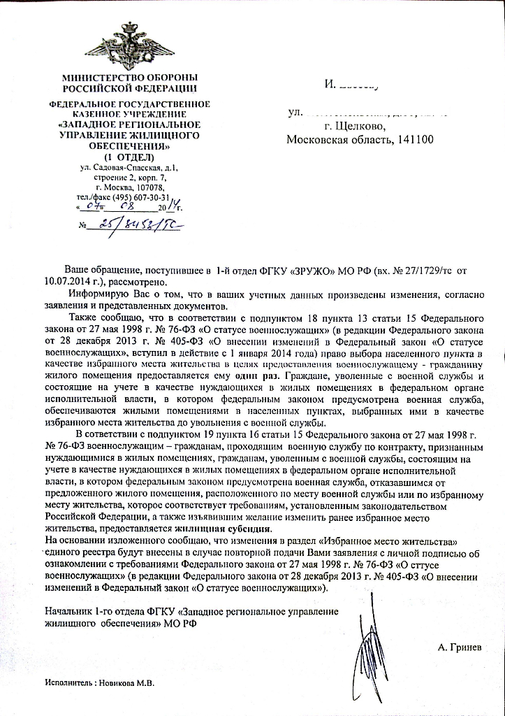 п.18 ст.15QR_BBPOST При постановке на очередь было предложено написать г Балашиха по месту прохождения службы. В 2014 году уволен.
