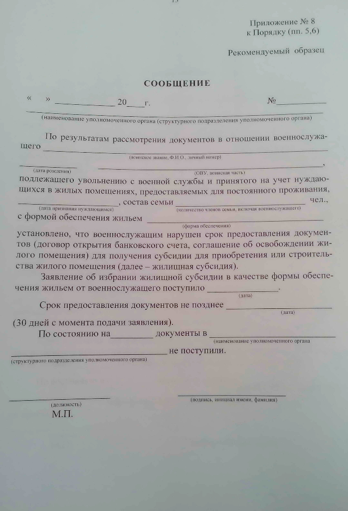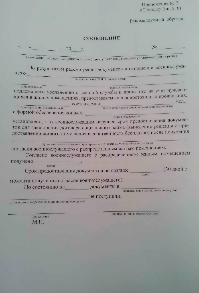 (адрес, атрибуты корреспондента в ДЖО (РУЖО)): в соответствии с требованием уведомления №.... от ..... вх..... сообщаю Вам, что в настоящий момент я состою в списке нуждающихся на получение жилого помещения в городе ...... в собственность бесплатно (по ДСН). решение о признании меня нуждающимся в жилом помещении принято (дата, место). соответствующая выписка из решения находится у меня на руках. с момента признания меня нуждающимся в жилом помещении предложений (извещений) на получение жилого помещения в соответствии с требованиями законодательства РФ в ИМПЖ не поступало, отказов от таких предложений не было. заявления на изменение формы обеспечения жильем я не подавал. согласие на увольнение из ВС РФ до обеспечения меня жилым помещением с оставлением в списках нуждающихся я не давал.
