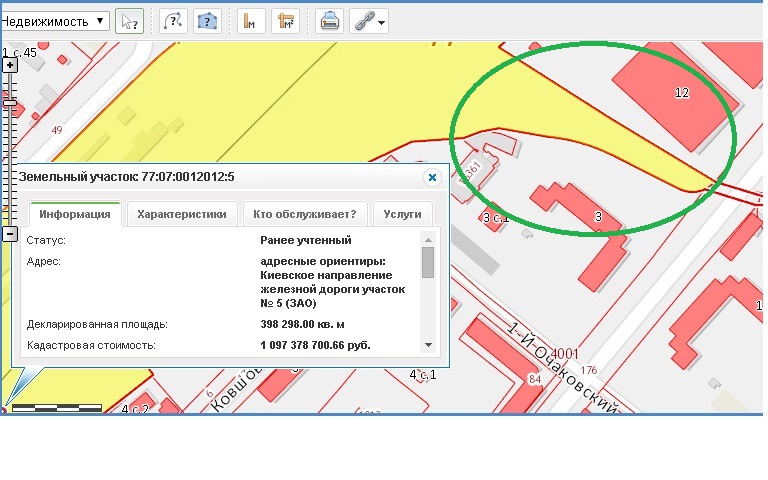 Рядом пролегает ж/д, наводим мышку, кликаем, читаем запись Росреестра: Земельный участок: 77:07:0012012:5, Статус: Ранее учтенный, Адрес: адресные ориентиры: Киевское направление железной дороги участок № 5 (ЗАО), Декларированная площадь: 398 298.00 кв. м, Кадастровая стоимость: 1 097 378 700.66 руб., Форма собственности: публичная, Дата постановки на учет: 16.05.2007, Кадастровый инженер: Очирова Наталья Владимировна, Квартал: 77:07:0012012, Район: 77:07, Округ: 77, Даты обновления: Атрибуты: 23.07.2015, Границы: 27.06.2015.
