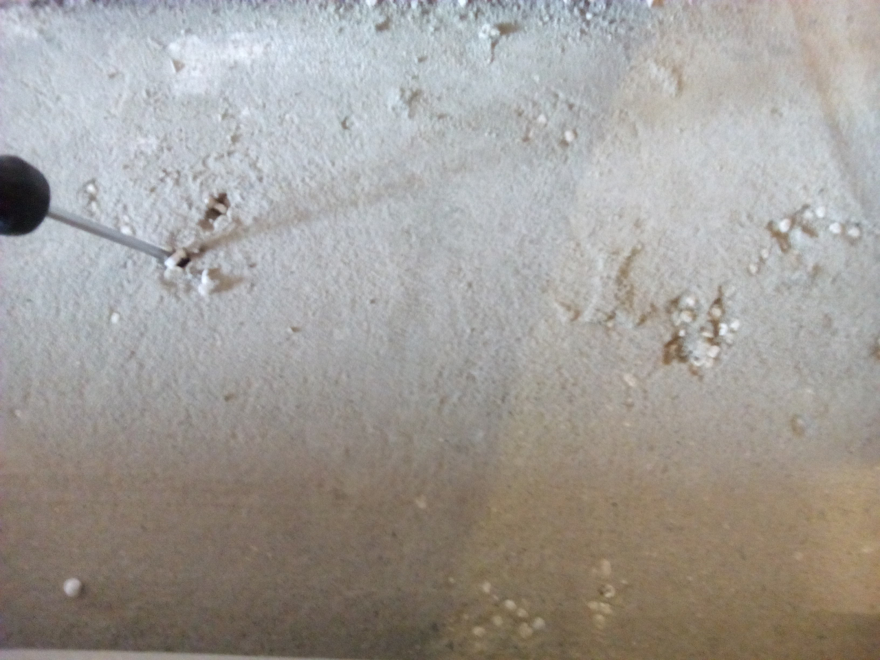 Это нормальное явление, при строительстве бюджетного жилья. Теперь вопрос, когда Вы вынимали отвертку из отверстия ржавчина не посыпалась? Если нет, то не все так плохо, вызовите штукатуров или сами заштукатурьте потолок и повесьте подвесные потолки. Смотрится красиво и белить не надо.QR_BBPOST Плита перекрытия в зале трешки. Белые шарики -это вкрапления кусков пенопласта, по всей плите. Отвертка входит свободно на всю длину.