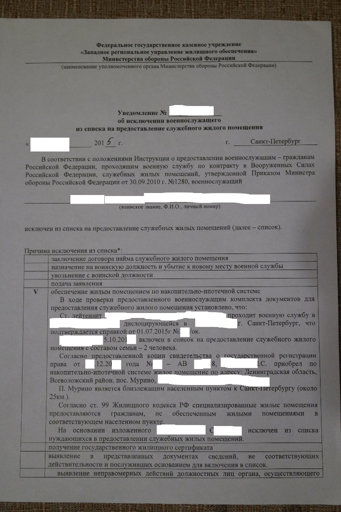 Сегодня получил на руки уведомление об исключении меня из списка нуждающихся в предоставлении служебного помещения.
