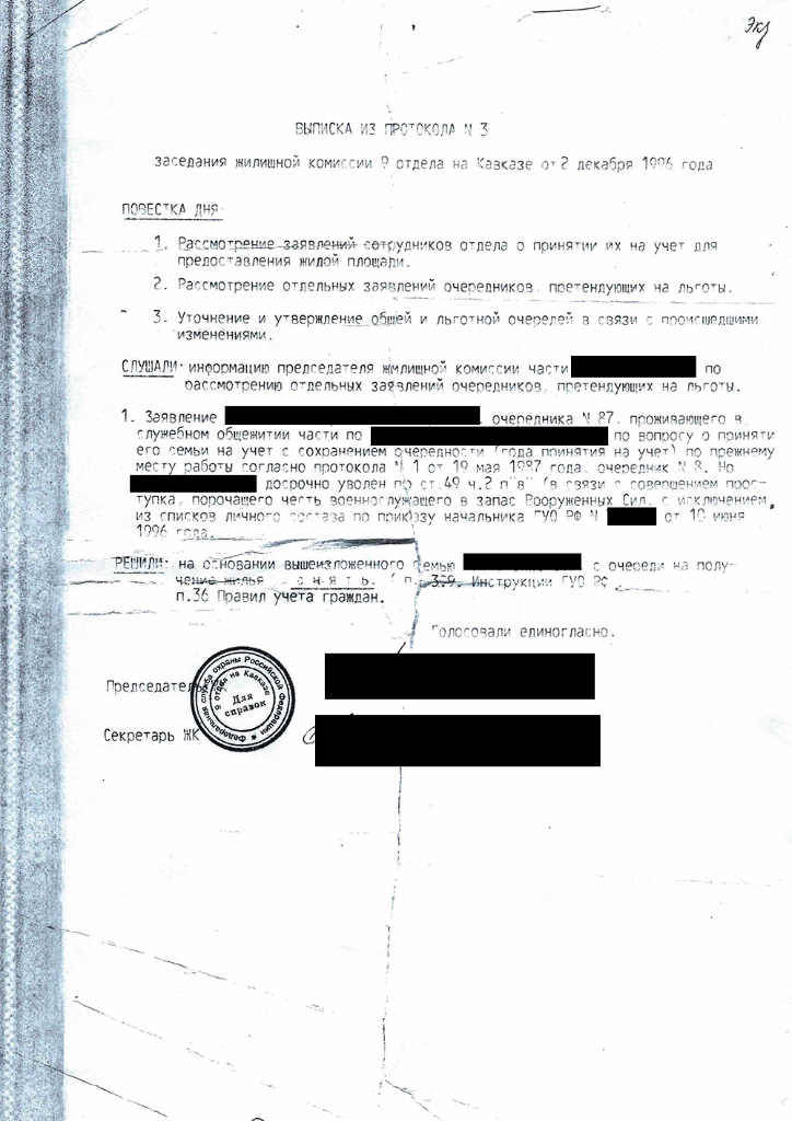 Это выписка из протокола о снятии, хотелось бы лицезреть её всю. И особенно выписку из протокола о постановке на жилищный учёт.QR_BBPOST По поводу снятия с очереди хотелось бы уточнить, законно ли это было и есть ли возможность через суд восстановиться. Имеется документ "Выписка из протокола заседания жилищной комиссии N отдела на Кавказе от 2 декабря 1996г. "согласно которому: