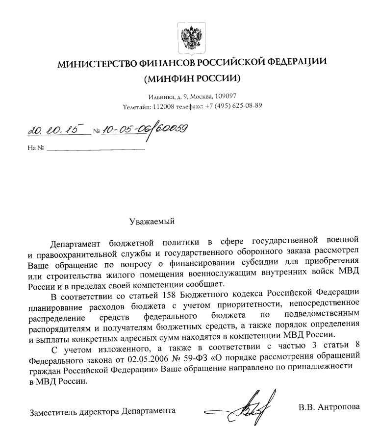 #255нам ответили из Гк вв мвд цитирую что бюджетные ассигнования на 2015г и на плановый период 2016 и 2017 год не предусмотрены, обращались на сайт президента так же писали в ФЭД все письма спускают в Г.К , а от туда один ответ нет денег .документы были сданы и рассмотрены 28.11.14г