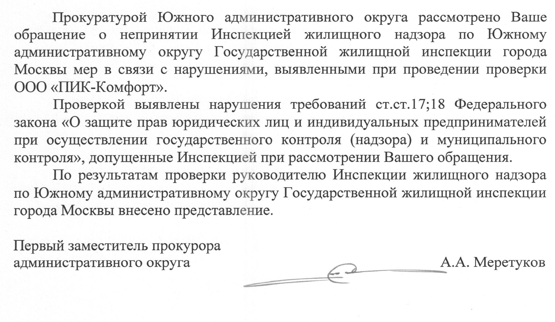 #843Ответ инспекции жилищного надзора по ЮАО г. Москвы, по вынесенному представлению прокуратурой ЮАО