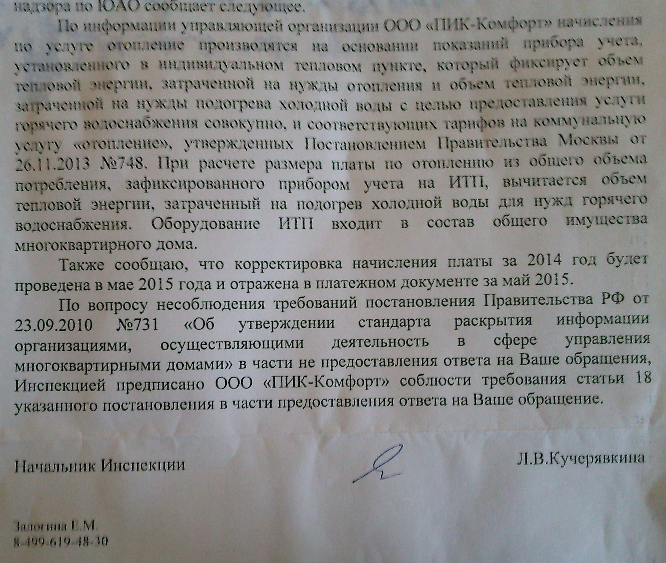 #843Ответ инспекции жилищного надзора по ЮАО г. Москвы, по вынесенному представлению прокуратурой ЮАО