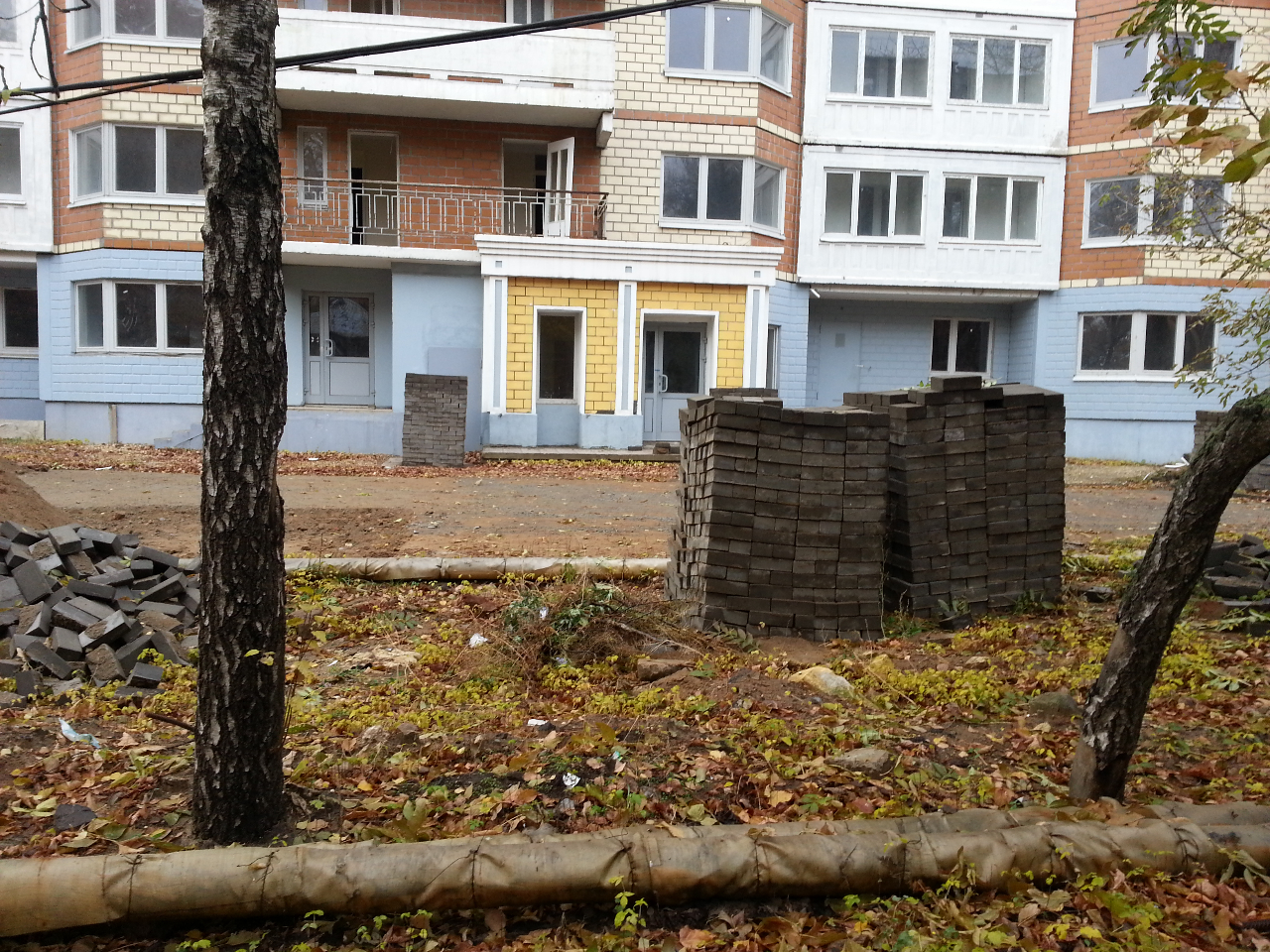 Корпус 3, вид от прокуратуры. Заботливо уложенную год назад плитку не менее заботливо собрали обратно в кучи.