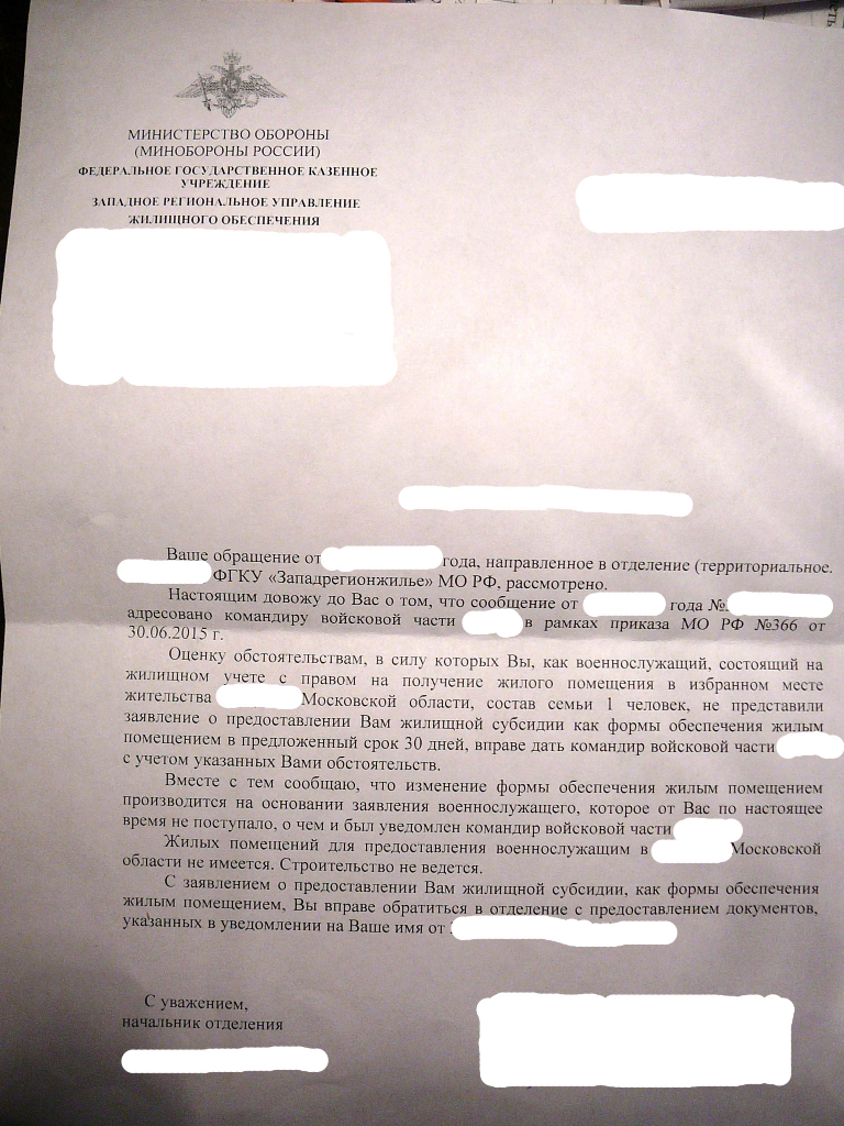 Будучи на переподготовке в другом городе получил уведомление о готовности предоставить ЖС. По прибытии в часть ознакомили с сообщением ДЖОшников командиру, в котором указано, что мной нарушен срок ответа. Написал рапорт командиру, что находился на переподготовке (в соответствие с приказом к/ч - командировке), срок ответа не истек. Написал в РУЖО о том, чтобы отозвали сообщение командиру, т.к. срок ответа на уведомление не истек, сообщение не достоверно и вводит командира в заблуждение, решение будет принято в установленные законом сроки. Получил вот это