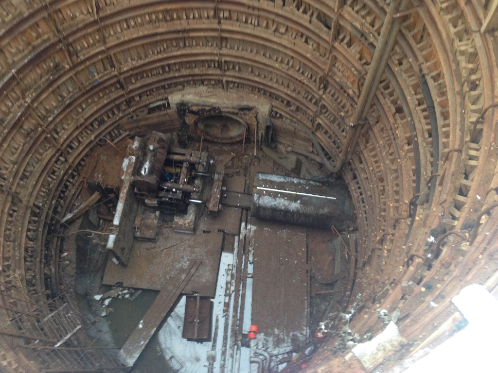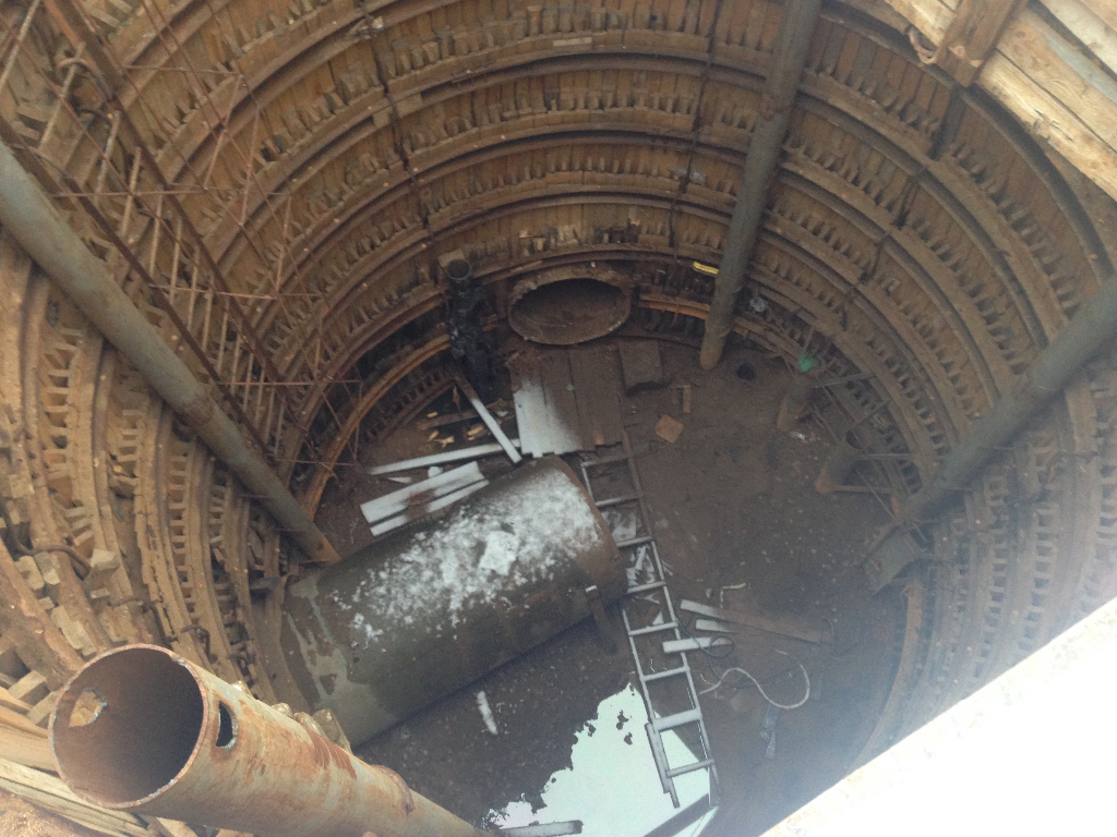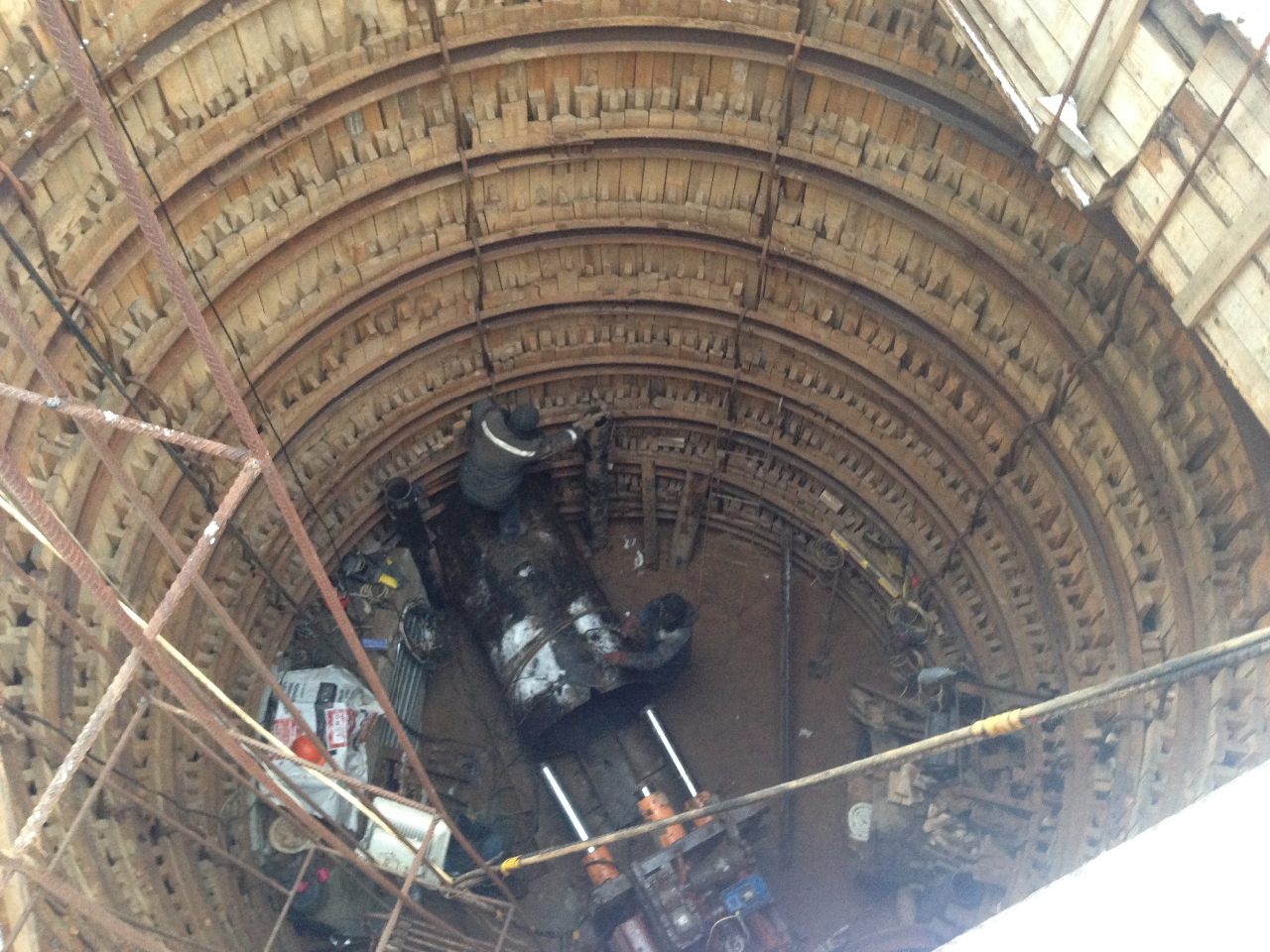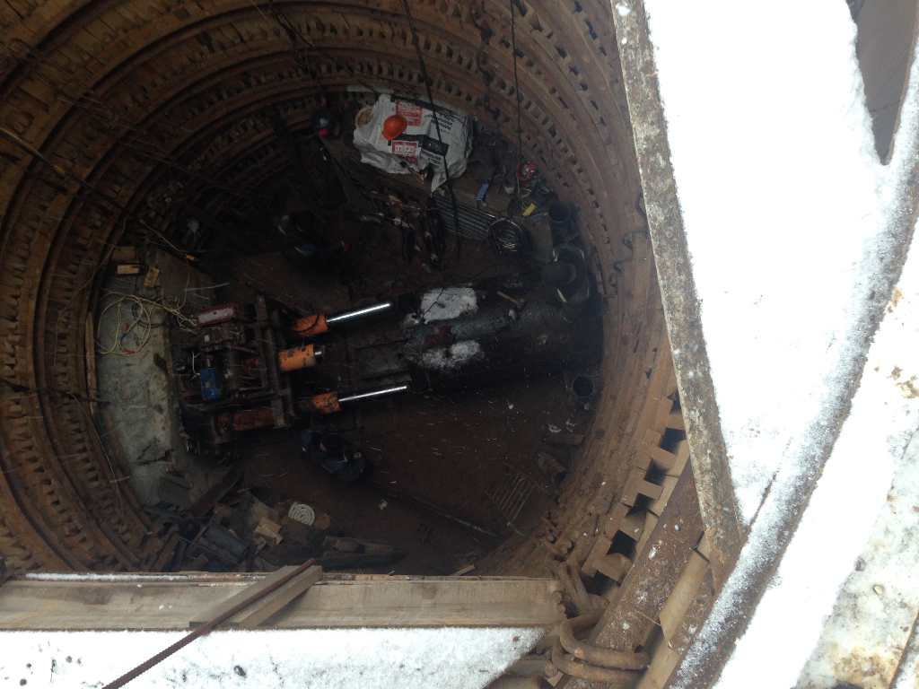 Инжстрой в колодце у поликлиники развернул оборудование и проводит наладку по его настройке, для проходки параллельно ул. Беломорской в колодец у дома 13 по ул. Беломорской. Нужно будет пройти почти 70 метров. Немножко объясню, как это тяжело. Пресс продавливает секцию трубы, а потом человек проползает внутри трубы и протолкнув корыто, насыпает туда внутренний грунт. Корыто тросом вытягивают, а потом поднимают грунт наверх.